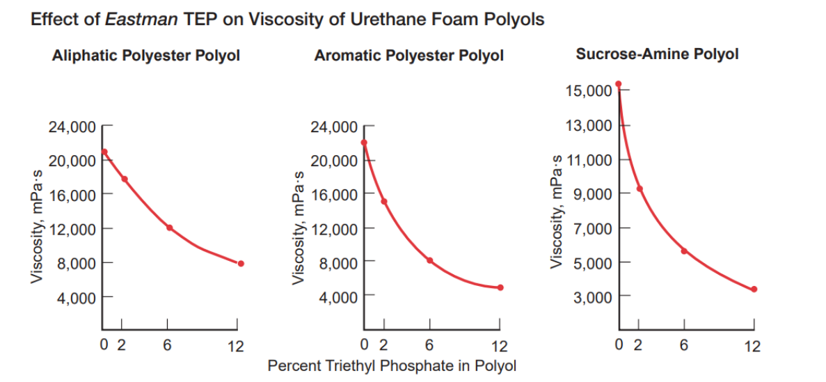 With the addition of 6% TEP, Eastman reduced the viscosity of the aliphatic polyester polyol used to produce flexible urethane by almost 50%. Aromatic polyester polyol and sucrose-amine polyol, which are used to make rigid urethane foam, experienced an even larger reduction.