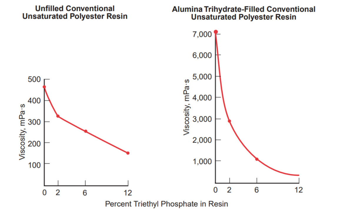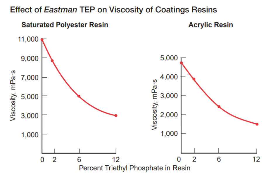 Eastman found that their TEP was more effective than other common phosphorus-containing synergists in reducing the viscosity of polyester/styrene solutions. The addition of 3% TEP was enough to lower the viscosity of the original polyester–styrene solution from 1,150 to 720 mPa·s.