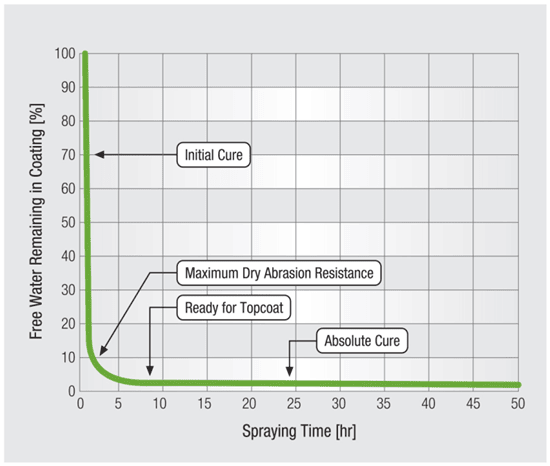 Zinc-rich primer and coating systems cure into a zinc silicate and polymerized silica matrix when water is removed. Like other water-based systems, zinc-rich primers and coatings cure fastest at higher temperatures and lower humidity. The information below provides guidance pertaining to the approximate timeframe for cure based on various conditions.