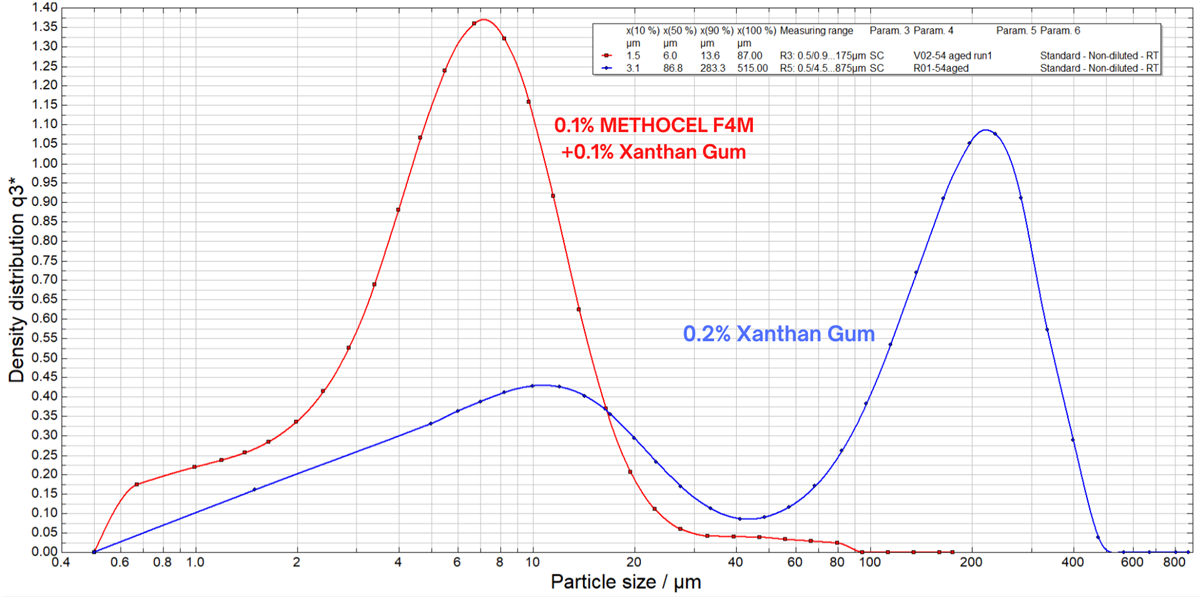 La goma xantana se utiliza habitualmente en los concentrados en suspensión como modificador reológico y estabilizador debido a su rentabilidad.  La sustitución completa de la goma xantana en una formulación comercial puede no ser factible desde el punto de vista del coste, aunque se desee mejorar la estabilidad de la formulación.  En estos casos, METHOCEL™ puede mezclarse con la goma xantana para inhibir el crecimiento de cristales y mejorar la estabilidad de la suspensión del ingrediente activo, al tiempo que se minimiza el efecto sobre los costes de las materias primas.  La distribución del tamaño de las partículas de la misma formulación modelo basada en Metribuzin se probó con una mezcla de xantano y METHOCEL™ F4M utilizada como estabilizador y se comparó con la formulación estabilizada sólo con goma xantana para demostrar cómo METHOCEL™ mejora la estabilidad de la suspensión cuando se mezcla con goma xantana.