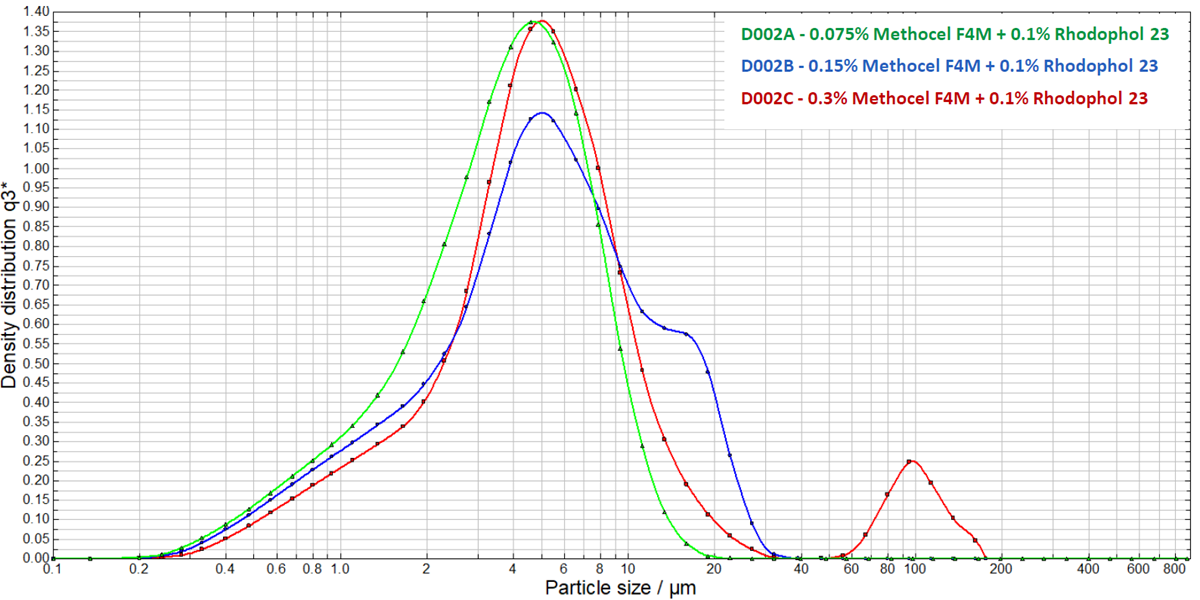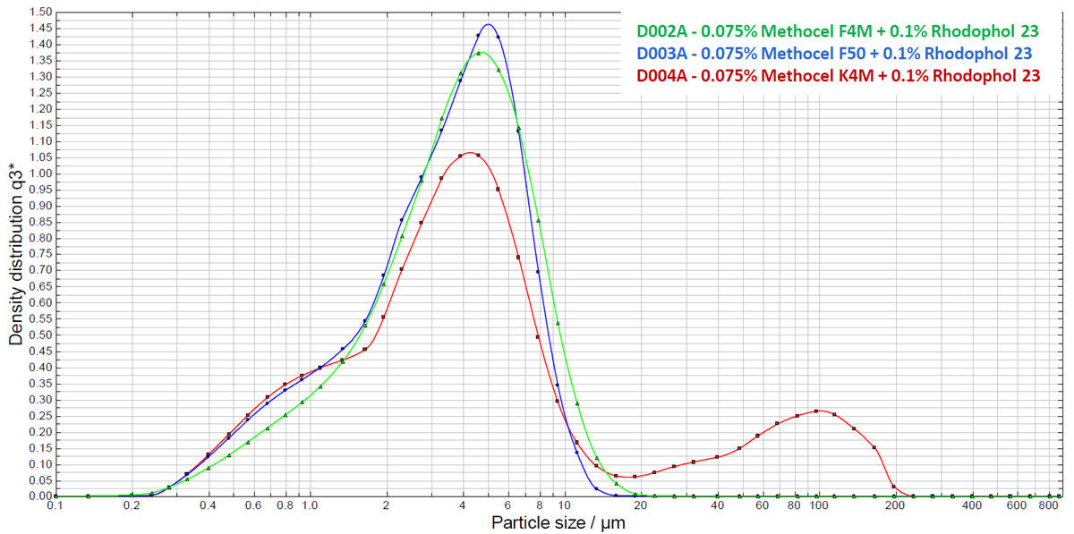 Los datos de distribución del tamaño de las partículas anteriores muestran que sustituyendo el 0,1% de goma xantana por el 0,1% de METHOCEL™ F4M se puede inhibir el crecimiento de cristales del ingrediente activo y hacer que la suspensión sea mucho más estable durante el almacenamiento.  También vale la pena señalar que sólo las formulaciones de prueba que contenían METHOCEL™ en su totalidad o como parte de una mezcla de estabilizadores mostraron la propiedad de inhibición del crecimiento de cristales.