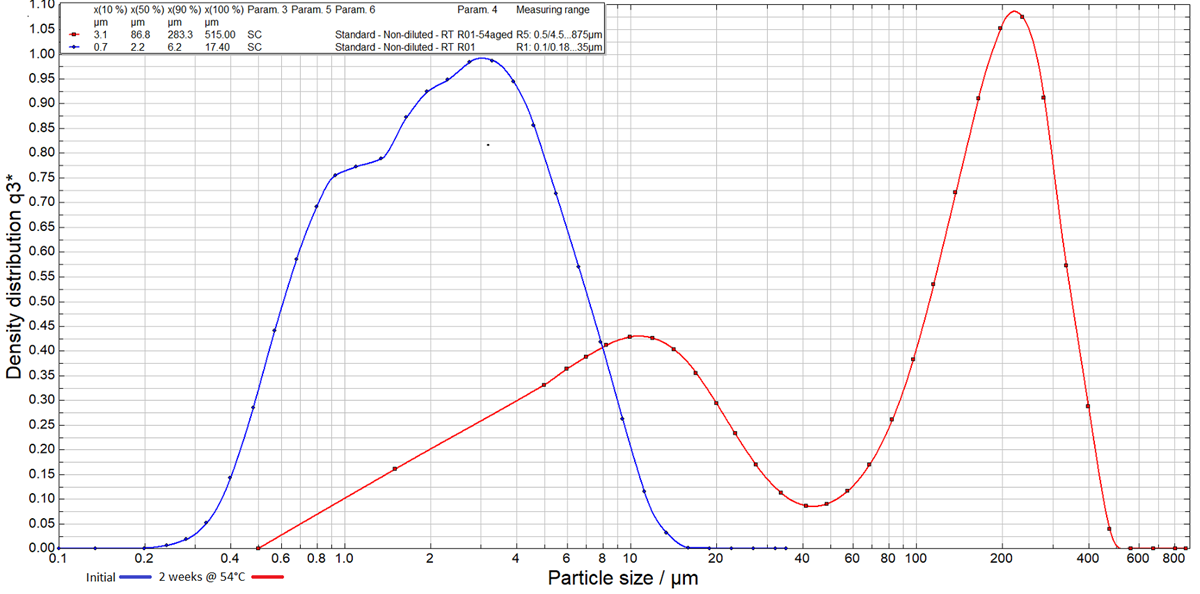 Distribución del tamaño de las partículas tras el almacenamiento durante 2 semanas a 54°C