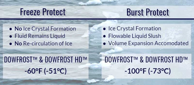 Burst protection accounts for temperatures that fall well below the lowest anticipated ambient temperature freezing and ice crystals begin to form.  Fluids remain flow-able as a slush-liquid mixture and systems are protected as long as expansion volume is accommodated.