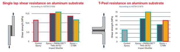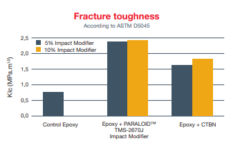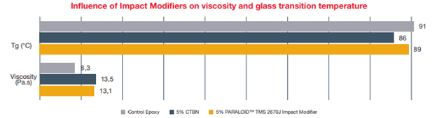 Furthermore, the newest MBS Impact modifier grade, PARALOID™ TMS-2672 Impact Modifier, exhibits a slight increase in viscosity over a base epoxy resin and a considerable reduction in viscosity compared to traditional CSR additives.