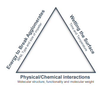To achieve a seamless dispersion process, vital for formulation and performance, new designs in surface interaction and chemistry were employed, along with advanced isolation techniques. This can be seen illustrated in the dispersion triangle below: