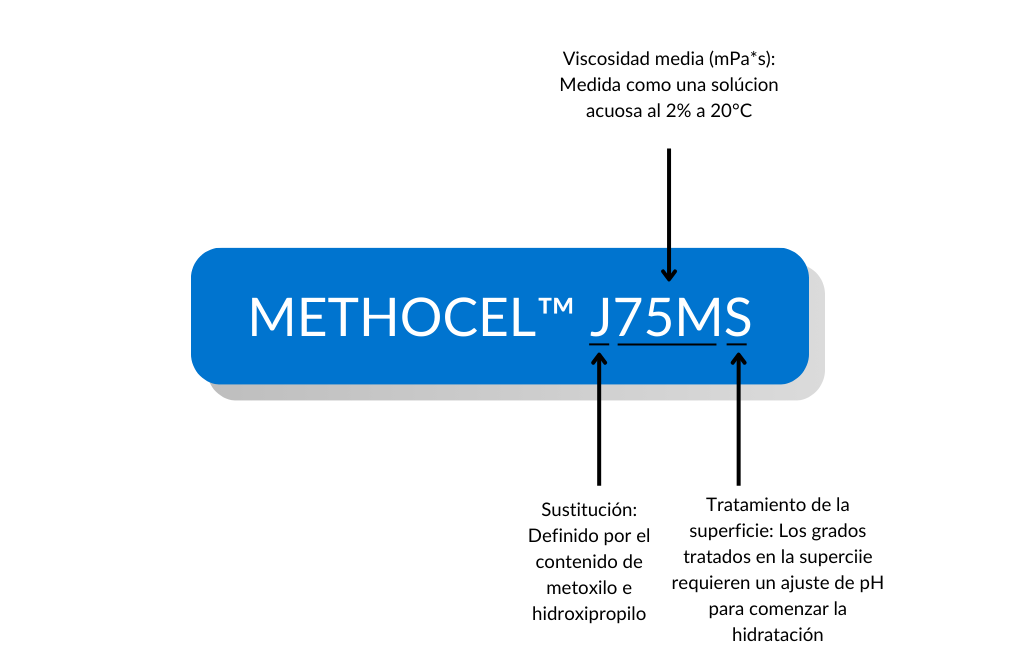 La selección de los grados de METHOCEL™ es determinada por dos criterios principales: la viscosidad (peso molecular) y el grado de sustitución. Estos criterios pueden ser identificados por la nomenclatura del grado. Por ejemplo: