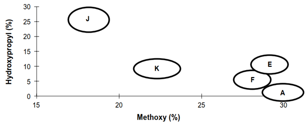 METHOCEL™ is available in a variety of grades with different substitution levels for methyl and hydroxypropyl groups attached to the cellulose backbone.  A letter is used in each product to denote the specific degree of substitution of both methoxy and hydroxypropyl groups, as shown in the diagram below:
