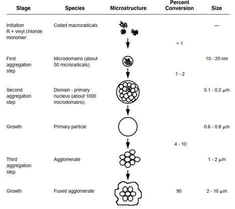 PVC is predominantly manufactured through the process of suspension polymerization, where it is known as suspension PVC.  In this process, vinyl-chloride monomers (VCMs) are dispersed in water and react with free-radical initiators to form small droplets that contain the polymerization reactions.  These droplets then continually aggregate to form fused agglomerates that produce a PVC resin grain.  Below is a diagram of the mechanism that is thought to take place for suspension PVC polymerization.