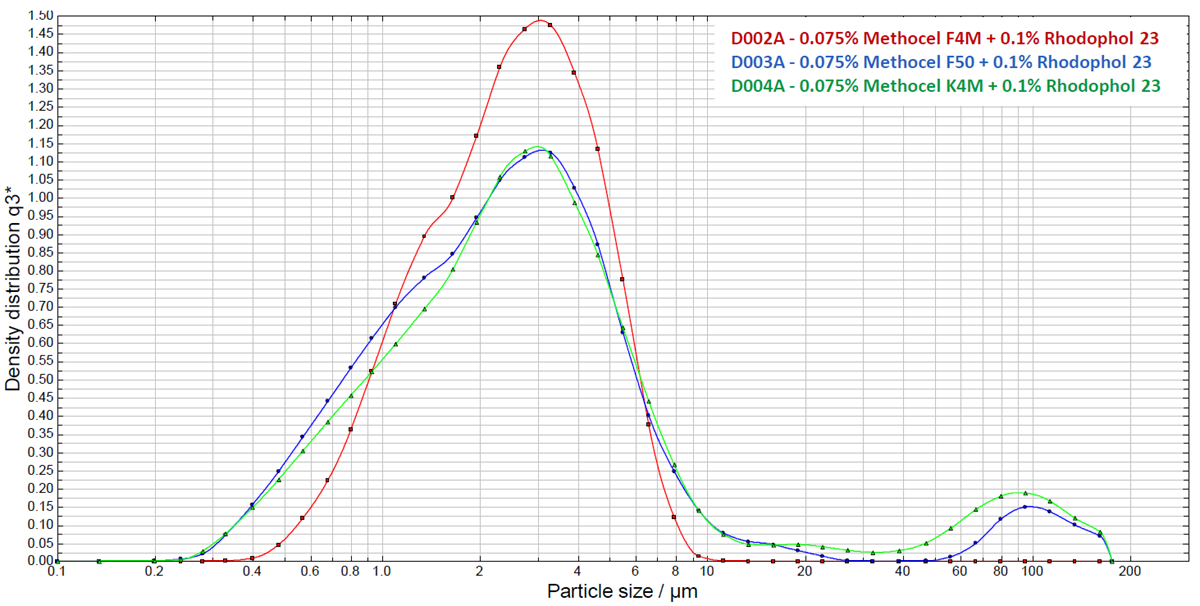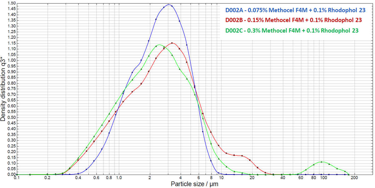Additionally, the impact of the concentration of METHOCEL™ on active ingredient stability was evaluated.  In this instance, METHOCEL™ F4M was blended with xanthan gum at varying levels for use as the stabilizer. After storage for two weeks, particle size distribution was measured at room temperature (RT) and 54°C.
