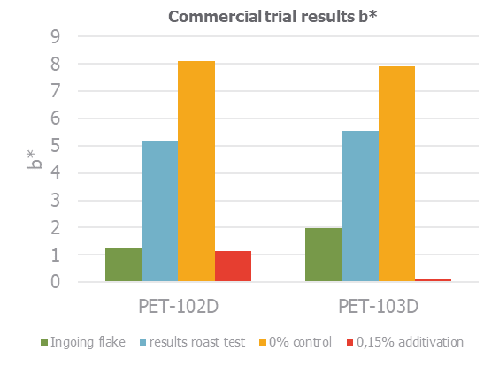 This grade was designed as a liquid blend to improve mechanical recyclers and recycled content that utilize PET resource streams by controlling the formation of yellowing and acetaldehyde (AA).