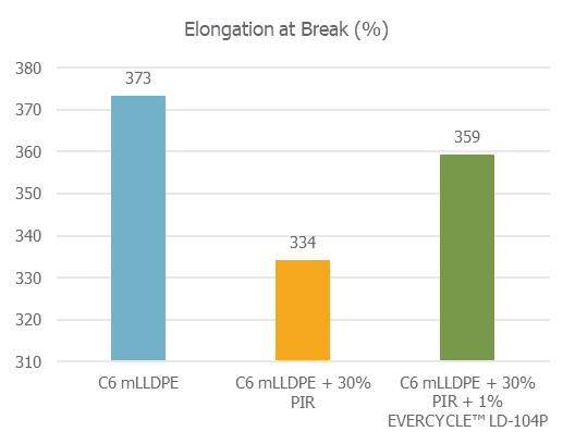 EVERCYCLE™ LD-104P with just a 1% dosage in a blended 70/30 virgin/pre-consumer, post-consumer recycled, and post-industrial recycled (PCR/PIR) stretch film by improving mechanical properties while containing gel formation.
