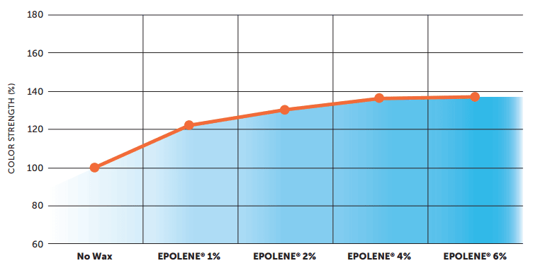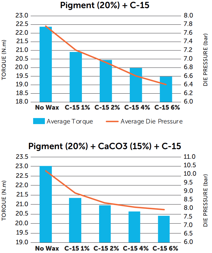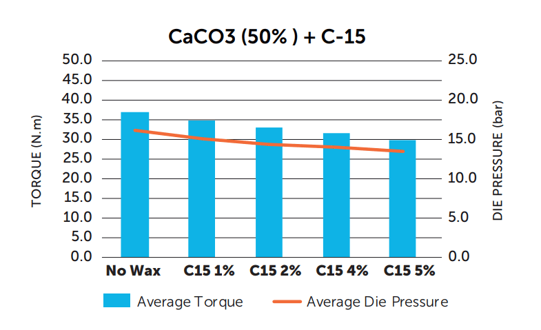 EPOLENE® también ha demostrado ser extremadamente útil como aditivo de procesamiento para masterbathces minerales con alto contenido de carga. En un estudio independiente, se preparó un masterbathc compuesto por un 50 % de LLDPE y un 50 % de carga mineral, con y sin EPOLENE®. Se midieron el par de torsión, la presión en la matriz y las propiedades mecánicas del masterbathc. Se observó una reducción del 4 % en la presión en la matriz con una carga del 5 % de EPOLENE® C-15 en comparación con el control, y una reducción del 28 % en el par de torsión con una carga del 5 % de EPOLENE® C-15 en comparación con el control.