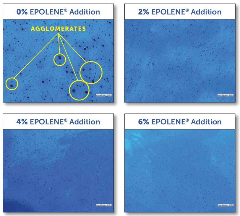 Para demostrar la utilidad de EPOLENE® como dispersante polimérico de pigmentos en masterbatches de color, un estudio de laboratorio comparó el tamaño y la distribución de las partículas de pigmento de una resina de polietileno lineal de baja densidad y un pigmento azul en una proporción de 15:3 en masterbatches formulados con y sin EPOLENE®. Las imágenes microscópicas del estudio se muestran a continuación.