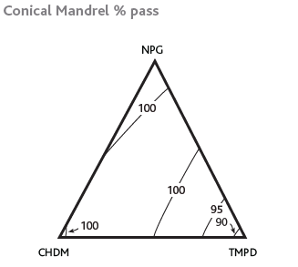 Flexibility testing revealed TMPD as the least flexible glycol. NPG- and CHDM-containing systems offered improved flexibility, with certain blends providing a favorable hardness–flexibility balance through synergistic effects.