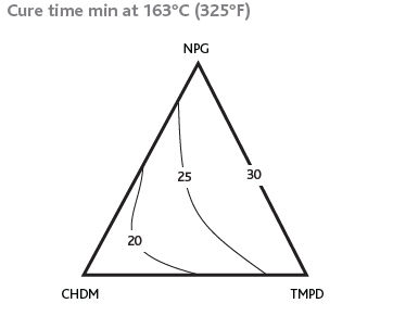 Cure response trends reflected glycol-structure effects beyond resin synthesis. CHDM-containing polyesters demonstrated the fastest cure rates when cross-linked, as shown below, consistent with their increased reactivity during processing.