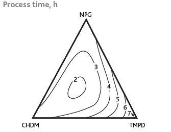 Several glycol blends demonstrated synergistic processing behavior, particularly combinations of CHDM and NPG, which delivered faster reaction times without a proportional increase in viscosity.