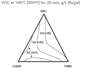 VOC and viscosity trends emphasized inherent structure–property trade-offs. NPG- and TMPD-based coatings showed similar VOC levels under controlled test conditions, as shown below, though TMPD is often associated with lower VOC potential in commercial formulations.