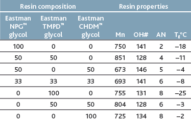 Using a designed mixture experiment, saturated polyester resins were prepared using varying ratios of these glycols as detailed in the chart below. To isolate the effect of the glycol structure, all resins were synthesized to similar acid numbers, hydroxyl numbers, and molecular weights.